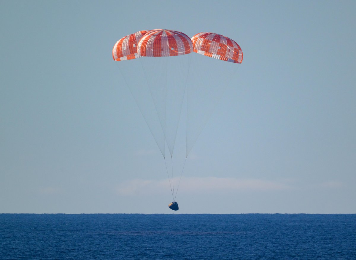 This image from April 10, 2026, captures NASA's Orion spacecraft, with its parachutes deployed, seconds before splashdown in the Pacific Ocean. The Artemis II crew accomplished many milestones on their nearly 10-day mission, surpassing the Apollo 13 record for farthest crewed spaceflight and capturing views of the far side of the Moon.